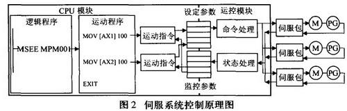 運動控制單元內部有三類參數:固定參數、設定參數和監控參數。其中固定參數包括電機參數、伺服驅動器參數、編碼器參數等固定數據;設定參數用來向伺服驅動器提供伺服控制命令,在系統運行時可以實時更改;監控參數由與伺服馬達相連的編碼器反饋到運動控制單元的電機運動狀態數據,這些監控數據可以在運動程序和邏輯程序中作為參考。CPU單元對運動控制單元的控制是通過其I/O端口與運動控制單元的參數相互對應建立的。為建立這種聯系,須將CPU單元的輸出I/O端口分配給運動單元的設定參數,輸進I/O端口分配給運動單元的監控參數。CPU單元在進行I/O刷新時將監控參數讀進內存,同時將伺服控制命令寫進到運動控制單元的設定參數中,實現對運動控制單元的控制。伺服系統的控制原理如圖2所示。