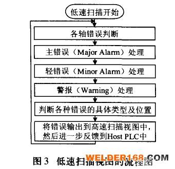 伺服系統控制程序采用模塊化編程,各自針對要求不同的應用設計了高速掃描視圖、低速掃描視圖和運動控制程序。系統上電之后,CPU就同時開始高速掃描與低速掃描兩個獨立的掃描過程,并在高速掃描過程中調用運動程序來進行運動控制。低速和高速掃描視圖的流程分別如圖3和圖4所示。